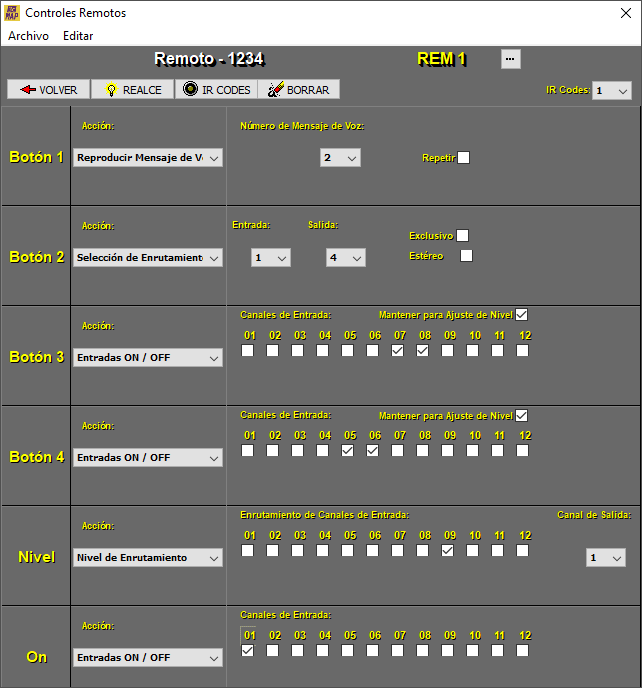 IR Codes: Esta pantalla muestra el código IR (InfraRojo) asignado a cada tecla. El dispositivo REM-2 permite aprendizaje de códigos para adaptarse a una gran variedad de remotos.