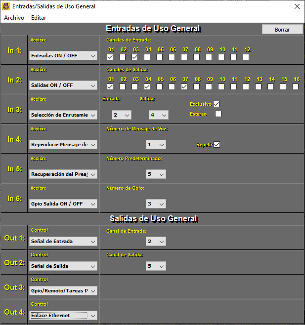 Entrada ON/OFF: La salida GPIO reflejará el estado del canal de entrada seleccionado (del 1 al 12). Cuando el canal de entrada seleccionado esté activado (-ON-), la salida GPIO estará activa (lógica 1, circuito conduciendo). Cuando dicha canal esté desactivado (-OFF-) la salida GPIO pasará a inactiva (lógica 0, circuito abierto).