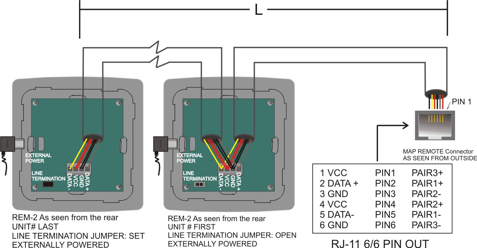 To compensate for cable losses, remotes connected more than 100 meters from the MAP processor or remotes from the eighth onwards must be powered locally by a commercial wall adapter of the micro USB type (preferably with an elbow connector).