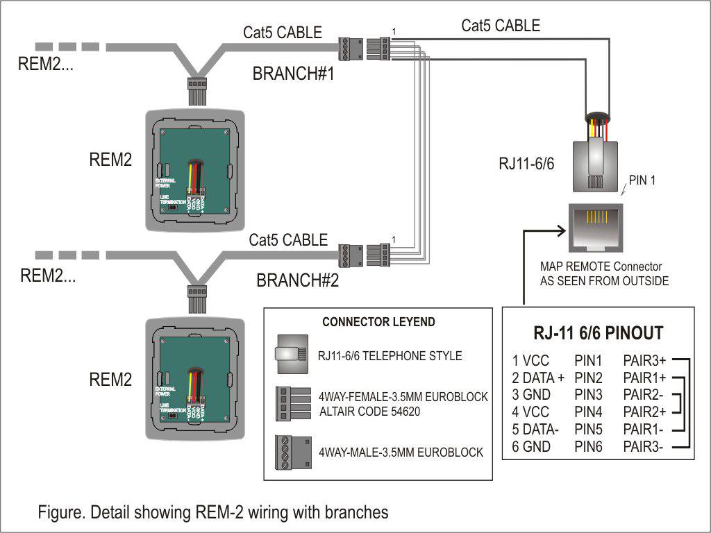 As described above, a set of REM-2/REM-2R units can be powered directly from the remote MAP wiring. The maximum allowable load on the MAP port is 500 mA which corresponds to the load of about 8 units. The use of external power supplies allows increasing the number of remotes or the distance to the processor.