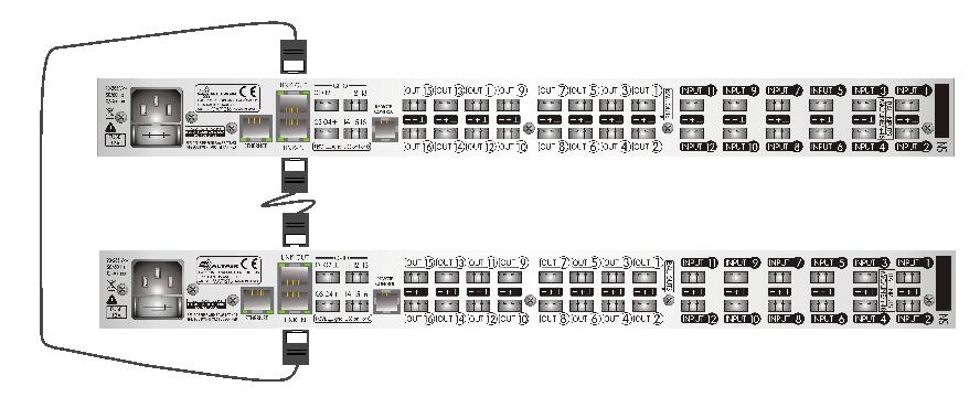 The chained or link is carried out by means of two connectors of the RJ45 type using 2 connecting cables used for Ethernet networks. These patch cords will be made up of 4 pairs of twisted cable Cat5 type.