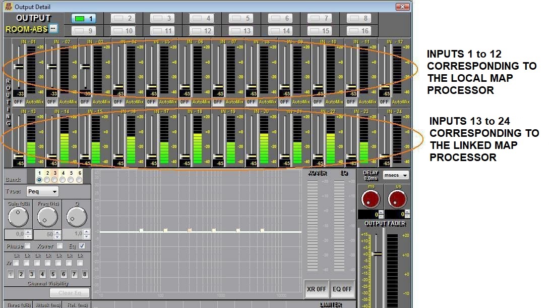 The 3cMAP software will detect the presence of the other device and will adapt in terms of the number of inputs to be processed in its Matrix section, OUTPUT CONFIGURATION program window. See figure below.