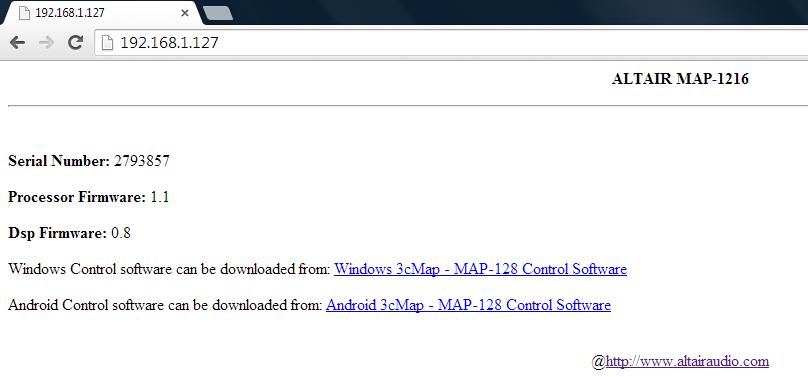 A first check of the processor's connection to the LAN can be done. To carry out this verification, connect the processor to the LAN network and using a browser on a PC connected to this network, enter the default address 192.168.1.128. If the connection is valid, the processor will reply with the following information page indicating the device data as well as a link to download the program from the Altair website. The IP address can be changed from the welcome page or from the 3cMAP program in the toolbar Edit → IP config.