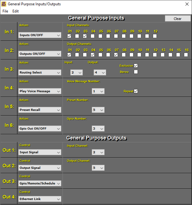 Routing Select : Switches the routing inputs on the selected outputs from on (0 dB) to off (-oo) and vice versa. Selecting the Stereo option allows a duo combination. Selecting the Exclusive option only the last selected input will remain active canceling the other routed inputs.