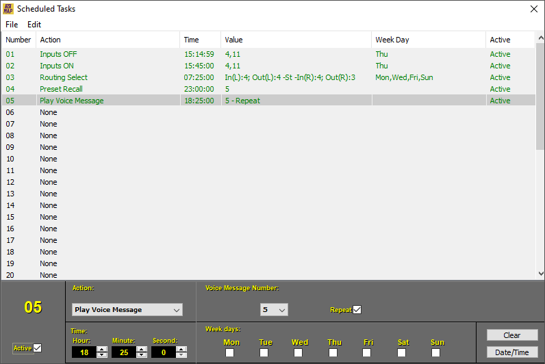 MAP processors incorporate a RTC real-time clock to allow various programmed actions to be performed repeatedly. You can define up to 40 repeating actions each day of the week.
