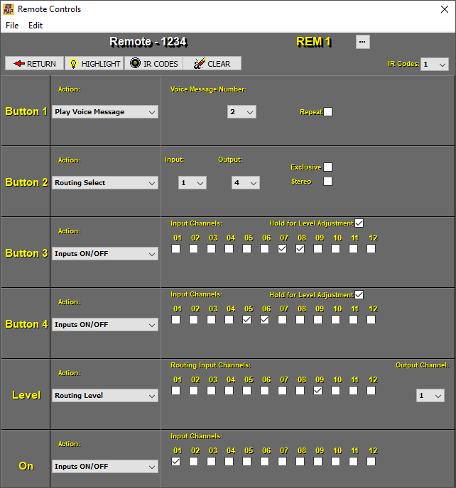 IR Codes: This screen shows the IR (InfraRed) code assigned to each key. The REM-2 device allows code learning to accommodate a wide variety of remotes.