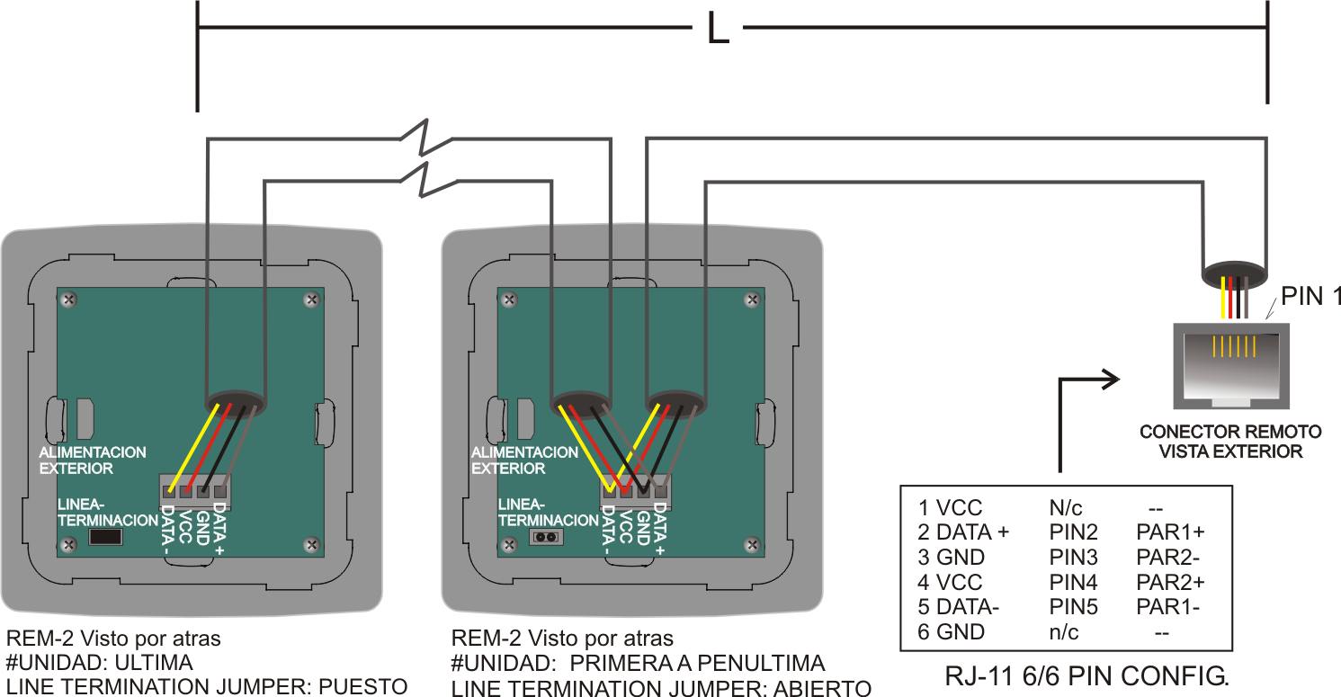 El cableado se realiza con 2 pares de cableado cat5 o equivalente (cuatro hilos en total) como se muestra en la figura.