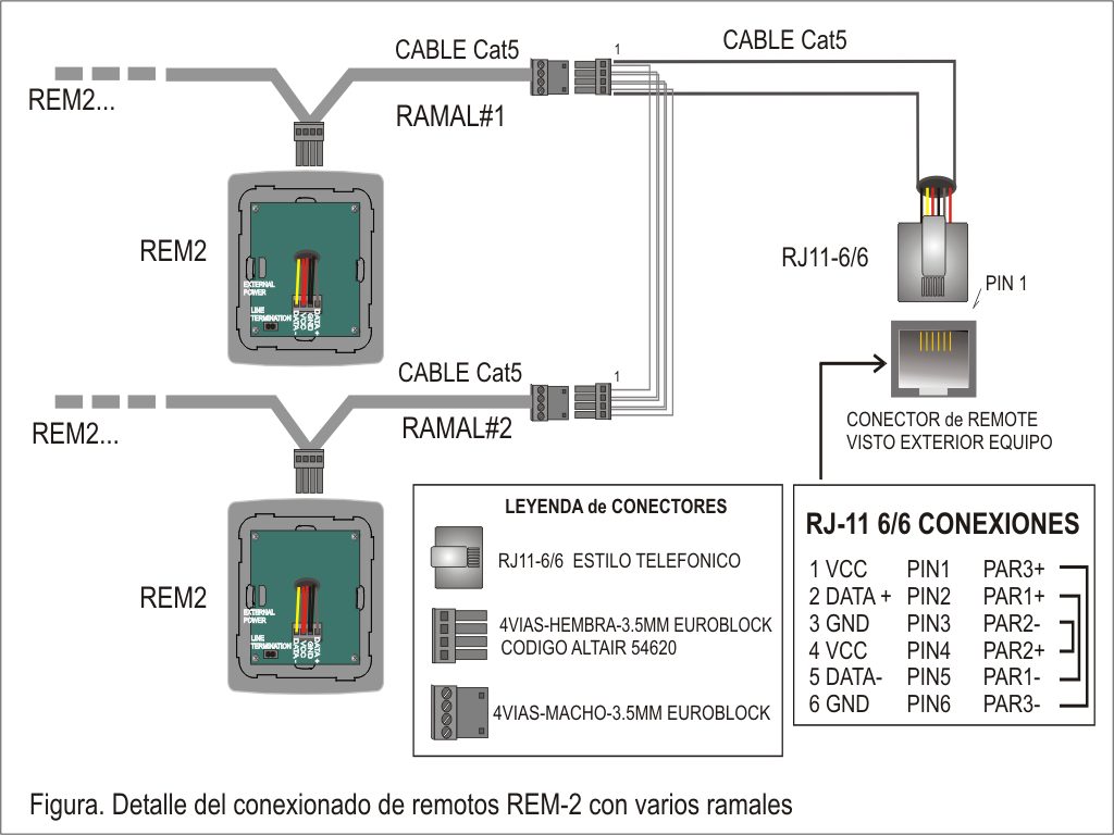 La conexión con el cableado remoto se realiza mediante un conector RJ-11 6/6 no incluido (disponible en tiendas de telefonía) en el lado del MAP y por una borna enchufable (-terminal block-) de 4 polos y paso 3.5mm incluida en el suministro. El conector admite cables con una sección de hasta 1,3 mm2 para permitir conectar los remotos mediante un montaje en cadena.