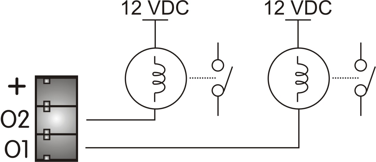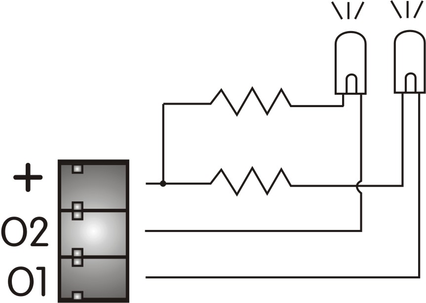 Las salidas son por colector abierto por lo que admiten señales de control con distintas tensiones ajenas al procesador (50 Voltios DC máximo). Para pequeñas cargas se puede emplear la tensión interna de 5 voltios DC (borna +) para alimentar circuitos externos con una carga maxima de hasta 500 mA en total. Estas salidas se pueden conectar a indicadores tipo LED y a relés entre otros. Si la carga requiere una tensión/corriente superior a la especificada anteriormente se puede recurrir a fuentes externas (50 V/500mA max.).