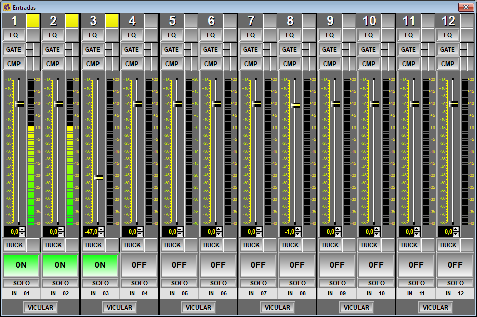 En esta sección aparece una vista global de las 12 entradas con sus parámetros más importantes de un vistazo. Para un ajuste más preciso vaya a la sección del Panel de Configuración de Entrada.